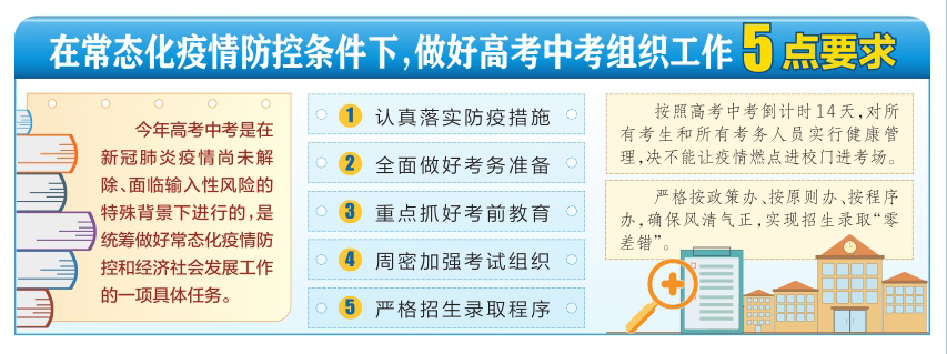 楼阳生对在常态化疫情防控条件下,做好高考中考组织工作提出五点要求。一是认真落实防疫措施。按照高考中考倒计时14天,对所有考生和所有考务人员实行健康管理,具体到人、不漏一人,认真落实考点清洁消毒、体温检测、闭环管理等防控措施,决不能让疫情燃点进校门进考场。二是全面做好考务准备。按照“谁主管谁负责”原则,高考考务工作由省级组织实施,中考考务工作由各市组织实施。各级各有关部门要强化统分结合的责任体系,落实责任,协调联动,切实为高考中考顺利进行提供有力保证。各级教育行政主管部门要加强考务准备工作,认真检查、认真评估、认真验收,切实把存在的短板、漏洞、风险解决在考试之前。三是重点抓好考前教育。教育部门要作专门部署,从心理调适、科学备考、从容应考、正确看待考试成绩等方面加强针对性指导,以案说理,教育引导考生及家长保持健康平和心态。四是周密加强考试组织。加强对考试全流程的管理管控,确保各环节无缝衔接、不留盲点。依法依规严处考试作弊、危害考试安全、扰乱考试秩序等行为,做到严肃纪律、严保公平、严守底线,确保高考中考公正权威。五是严格招生录取程序。招生录取工作要讲规定、讲规则、讲规矩,严格按政策办、按原则办、按程序办,确保风清气正,实现招生录取“零差错”。要加强对招生录取政策的宣传引导、解疑释惑,让考生及家长放心安心。